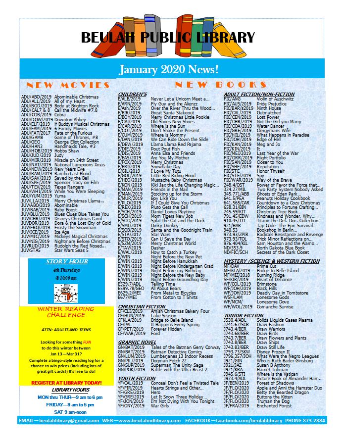 January 21, 2020January 21, 2020 Beulah Public Library Monthly Newsletter